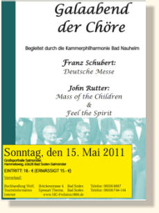 Großes GalakonzertDer Mc Frohsinn tritt mit rund 70 Sängern zu einem unvergesslichen Konzert an. Begleitet wurde der Chor durch die Kammerphilharmonie Bad Nauheim, die zu dem Erfolg und dem Erlebnis wesentlich mit beigetragen hat.